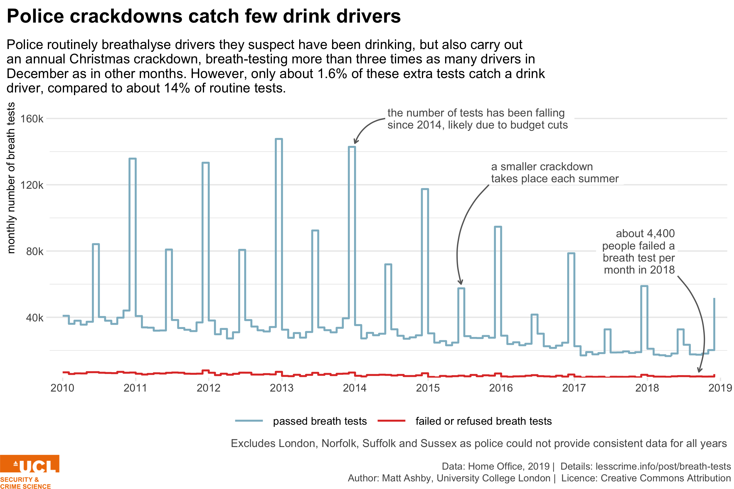 Police routinely breathalyse drivers they suspect have been drinking, but also carry out an annual Christmas crackdown, breath-testing more than three times as many drivers in December as in other months. However, only about 1.6% of these extra tests catch a drink driver, compared to about 14% of routine tests.