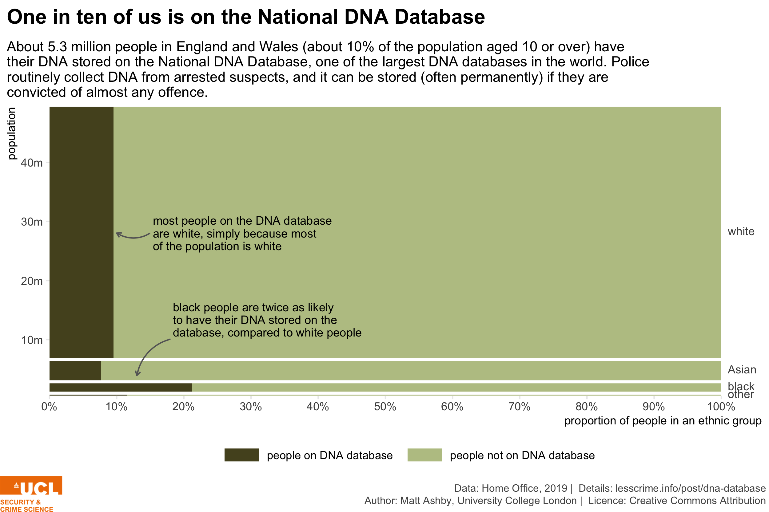 Since the National DNA Database does not have an equivalent ethnicity category to the ‘Mixed/multiple ethnic group’ categories in population data, people in these groups have been categorised on this chart as being of Black, Asian or other ethnicity.
